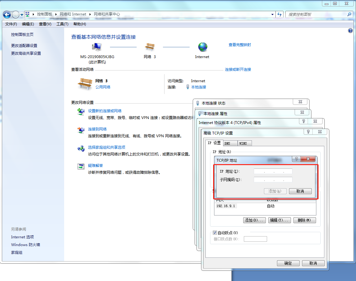 点击“开始 - 控制面板 – 网络和Internet - 网络和共享中心 - 更改设备适配器”找到物理网卡,鼠标右击“属性”,选择Internet 协议版本 4 (TCP/IPv4),点击“属性”,添加一个同网段IP。