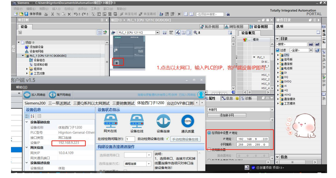3.点击组态界面,以太网接口,输入PLC的IP地址(客户端的设备IP即是,如图192.168.9.223)。